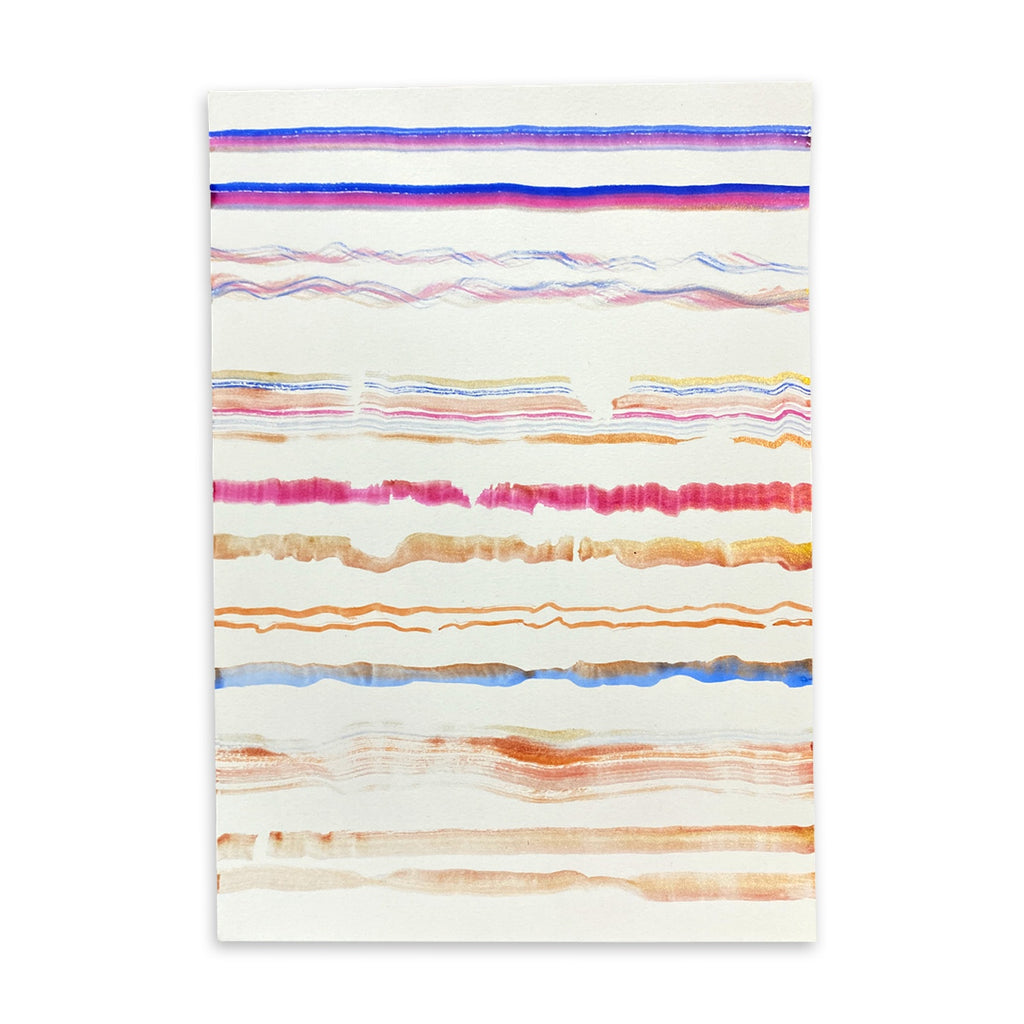 Earning a Master of Fine Arts from Whitecliffe College in 2013, Judi’s work is characterised by dynamic ink gestures exploring movement, place, and rhythm. A poetry workshop with Anthony Joseph at the Auckland Writers Festival sparked a new phase in her practice, merging sonnet writing with painting to create a visually poetic series. Her ability to translate emotion into fluid compositions is exemplified in her large scale ink commission for The Auckland Abstract Hotel’s Blue Room. Connection to land and water remains central to her work; unable to visit her ancestral river, Te Hoiere-Pelorus, in 2020-2021, she layered colour over earlier black and white river marks, creating a striking three dimensional effect. This exploration of place extends to her Native Bird Flight series, inspired by New Zealand birdlife. Judi’s artistic journey also includes cultural engagement and learning, notably studying Te Reo Maori at Te Wananga o Aotearoa (2018-2019), enriching the depth of her work. She has collaborated on major commissions, including a 4.5 meter ink drawing for Paska Dining Room at Auckland’s Naumi Hotel, which was later recognized by Forbes as one of the top ten airport hotels worldwide.