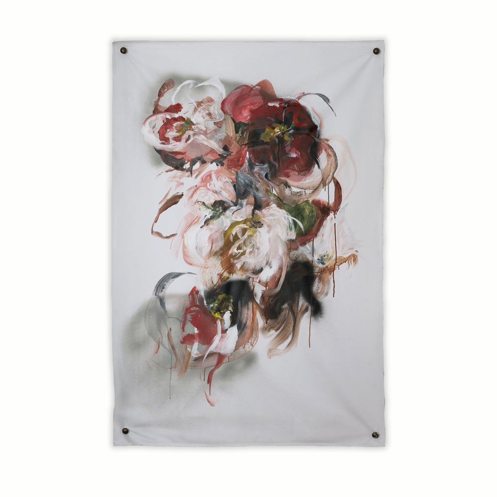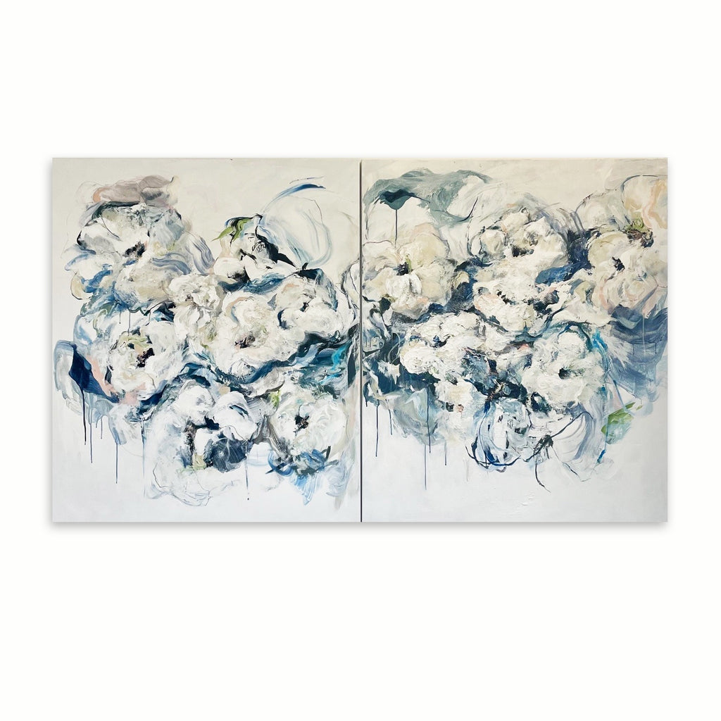 Exploring the balance between tension and freedom through loose, gestural brushstrokes and intuitive mark-making, Lizzie's work merges representation with abstraction. Using acrylic, oil stick and spray paint, she defines floral forms with white impasto against veils of grey, blue, blush and ochre washes. Ghostlike vessels emerge against dark backdrops, the blooms deliberately unrestrained, careful not to confine their billowing energy. The works exist on both stretched and loose canvas, lightly pinned, their willful, gently resilient blooms left uncaged, free and untethered in their cycle of growth, bloom, decline and decay. Together, they offer an admission to a life lived fully and well.
