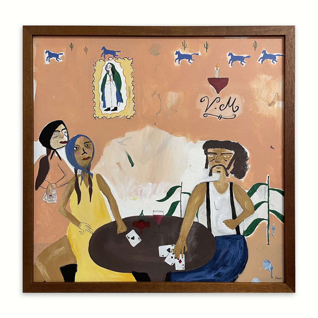 Working from his coastal studio, Matt lets intuition guide each work, allowing figures and scenes to emerge organically from the layered surface. His paintings carry the texture of lived experience, humorous, haunted and deeply human.